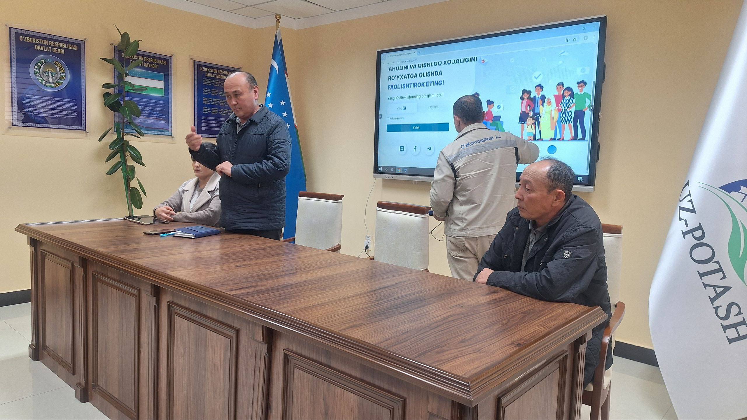 Mazkur Farmon ijrosini ta’minlash maqsadida bugun “Dehqonobod kaliy zavodi” AJ mas’ul xodimlari учун oʻquv seminari tashkil etildi. Seminar davomida ishtirokchilarga aholini roʻyxatga olish jarayonining mazmun-mohiyati, uni ish joyida tashkil etish tartibi, shuningdek, census.stat.uz portali orqali roʻyxatdan oʻtish bosqichlari yuzasidan batafsil tushuntirishlar berildi.