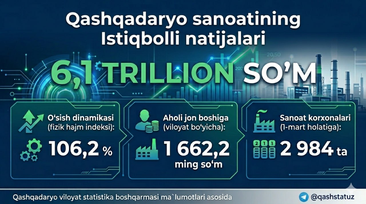 Qashqadaryo viloyati statistika boshqarmasining dastlabki ma’lumotlariga ko‘ra, 2026-yilning yanvar-fevral oylarida viloyatimizda jami 6,1 trillion so‘mdan ziyod sanoat mahsulotlari ishlab chiqarilgan.