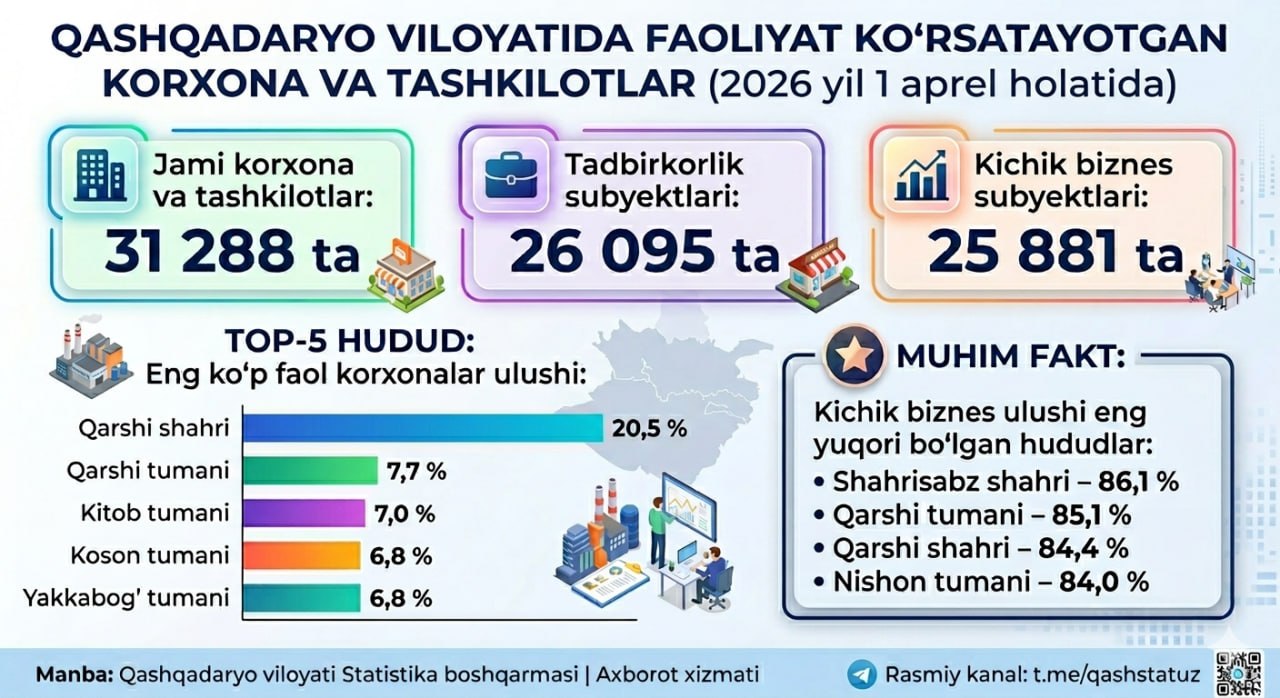 Jami faoliyat ko'rsatayotgan korxona va tashkilotlar: 31 288 ta