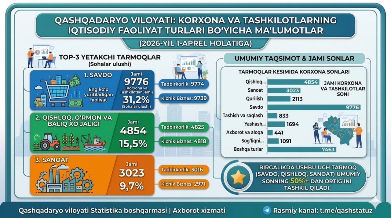 Qashqadaryo viloyati statistika boshqarmasi 2026-yil 1-aprel holatiga koʻra korxona va tashkilotlarning iqtisodiy faoliyat turlari boʻyicha dastlabki tahliliy maʼlumotlarini taqdim etadi.