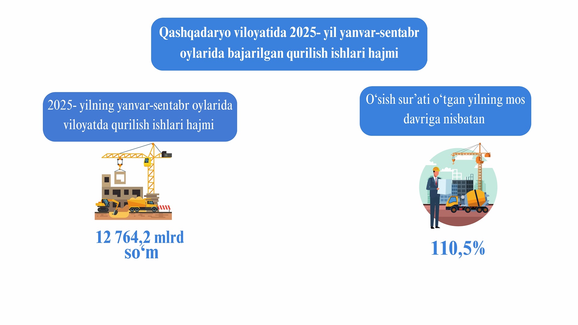 Qashqadaryo viloyatining qurilish ishlarining asosiy ko'rsatkichlari 2025 yil yanvar sentabr holatig