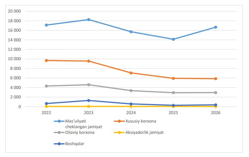 2026 - yil 1 - mart holatiga ko‘ra, Qashqadaryo viloyatida 25 875 ta faoliyat yuritayotgan tijorat korxonalaridan 16 674 tasi mas’uliyati cheklangan jamiyatlarni tashkil etib, ular tashkiliy huquqiy shakli bo‘yicha korxonalar orasida birinchi o‘rinni egallab turibdi.