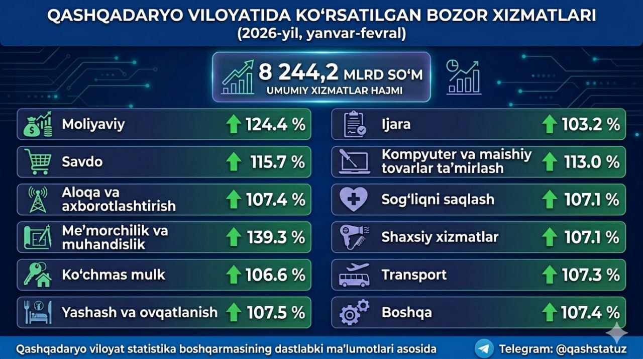 Qashqadaryo viloyat statistika boshqarmasining dastlabki maʼlumotlariga ko‘ra, 2026-yilning yanvar–fevral oylarida viloyatda ko‘rsatilgan bozor xizmatlari hajmi 8 244,2 mlrd so‘mni tashkil etdi.