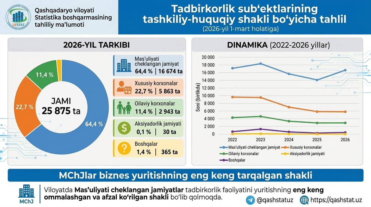 2026-yil 1-mart holatiga ko‘ra, viloyatimizda faoliyat ko‘rsatayotgan jami 25 875 ta tijorat korxonalarining tashkiliy-huquqiy shakllari tahlil qilindi.