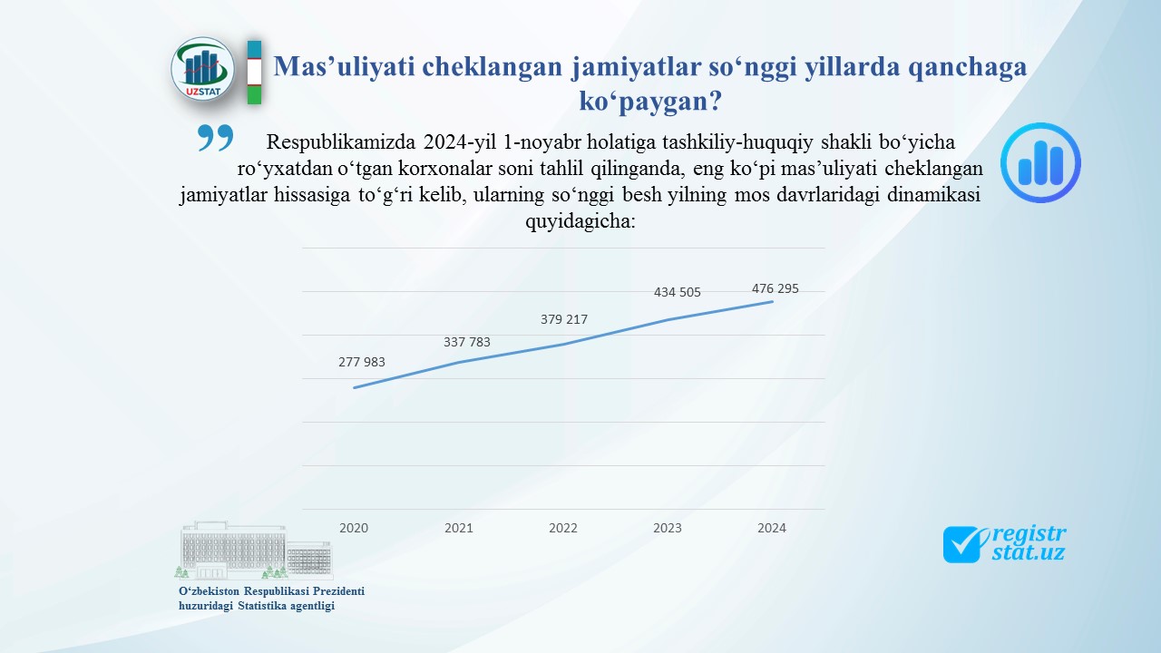 Joriy yilning 7- yanvar kuni Oʻzbekiston Respublikasi Prezidenti huzuridagi Statistika agentligida Qoraqalpogʻiston Respublikasi, viloyatlar va Toshkent shahar statistika boshqarmalarining Statistik registrlarni yuritish boʻlimi xodimlari uchun korxona va tashkilotlar yagona davlat registri (KTYADR) bazasini shakllantirish va ularni yuritish masalalariga oid ishlar holati va kelgusidagi ustuvor vazifalar yuzasidan onlayn vebinar tashkil etildi.